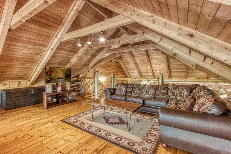 The upstairs loft is packed with all kinds of fun! A pool table and air hockey will keep you entertained for hours. A comfortable couch (sleeper) and television can also be found here!