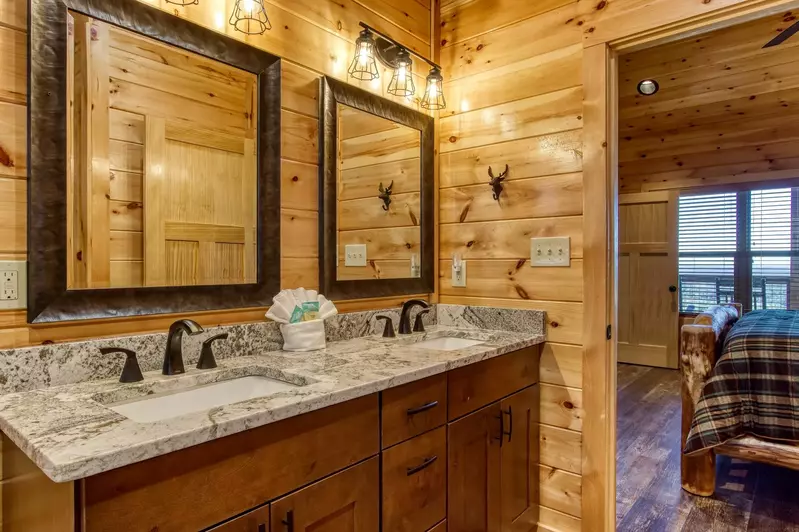 Divine View is a beautiful two-bedroom, two-bathroom cabin rental located just minutes from Dollywood and the heart of Pigeon Forge. Set within the popular Hidden Springs Resort, this single-level log cabin offers stunning panoramic views of the Smoky Mountains, a private hot tub, and resort-style amenities including seasonal access to the community pool.