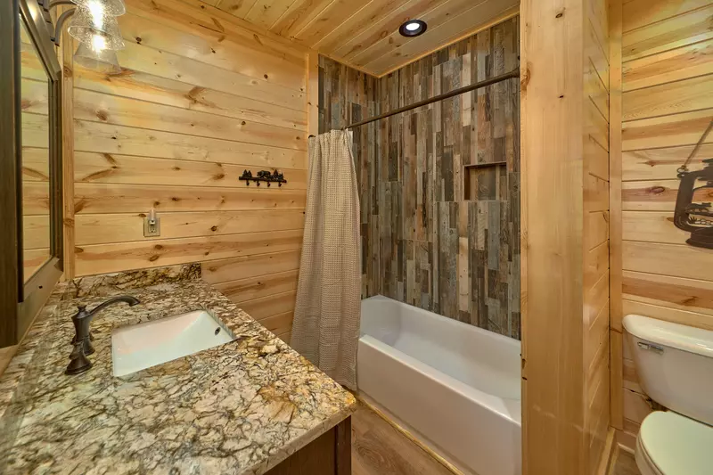 MAIN LEVEL: Enter through a covered deck into the kitchen area. As soon as the door opens, you will be so thankful that you chose Heaven’s View Lodge. A huge granite counter doubles as a kitchen island and a dinner table. The kitchen is loaded with everything you will need to prepare, serve and enjoy most any meal. The gas fireplace will keep those chilly nights at bay while watching the game or a movie in the living room. Large windows give an unobstructed view like no other. The Great Smoky Mountains can be seen in the distance and just on the other side of the hill, Dollywood’s summer fireworks will be seen from the comfort of the covered back porch! There are 2 bedrooms on this level, each with a King-sized bed and its’ own private full bathroom. Sleep up to 4 guests on this level.
